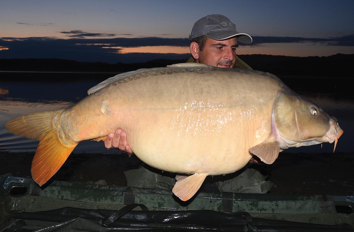Première carpe sur la zone amorcée, juste avant de retirer nos lignes : 20,2 kg.