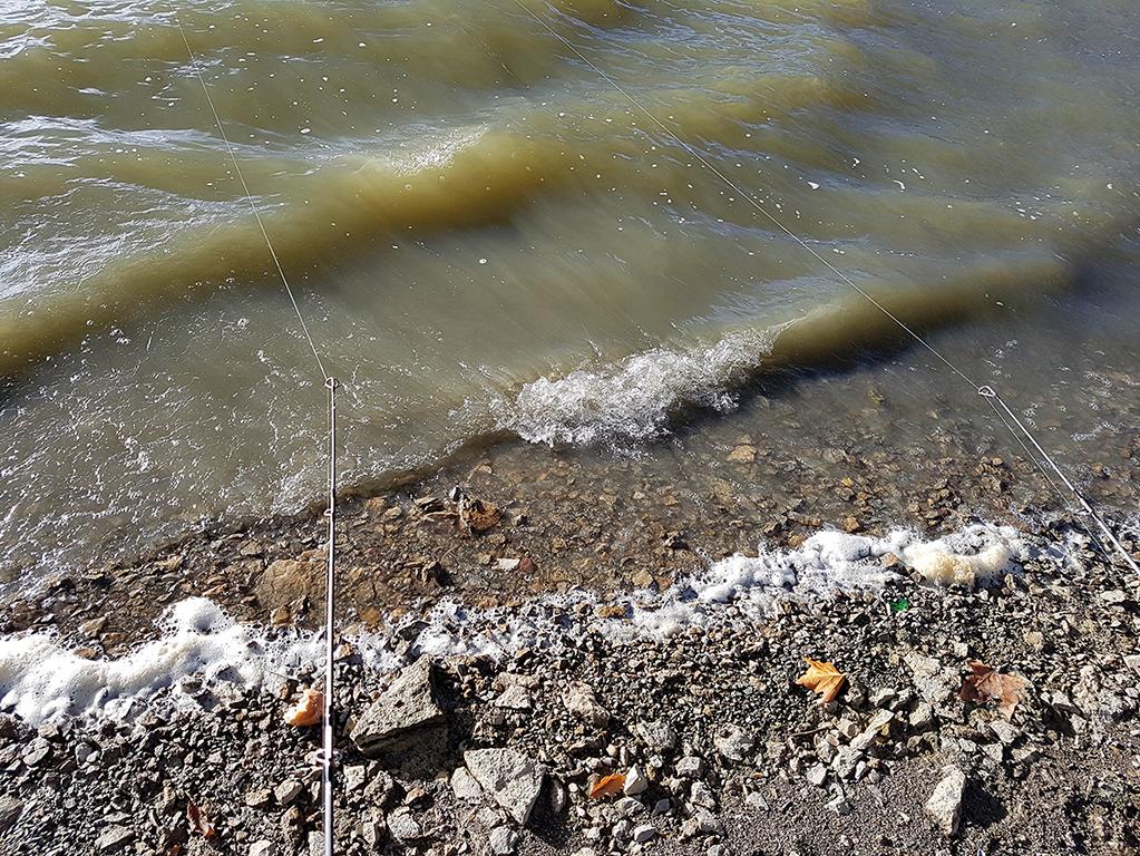 Dimanche est une journée bizarre. Le vent souffle fort, très fort, c’est la tempête. Le ciel est chargé. De grosses vagues s’abattent sur notre berge. Nous déposons nos lignes avec beaucoup de mal mais nous y arrivons quand même. Avec un vent comme ça on va sûrement cartonner. On se frotte déjà les mains. Mais il ne se passe rien du tout. Pas une seule touche ! Comment c’est possible ? Un drôle de phénomène se produit ce jour-là. Jusqu’à maintenant l’eau était assez claire, assez transparente. Mais la tempête qui brasse le lac crée des courants et contre courants très forts dans les faibles profondeurs. L’eau se trouble, devient marron, devient opaque…