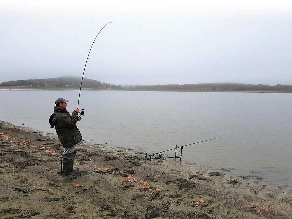 L’idée de base était de mettre en place la même stratégie que sur l’autre lac au mois de septembre : poser des repères, amorcer la zone et pêcher uniquement la journée. Le niveau du lac était assez bas mais la surface d’eau restante était encore assez impressionnante. Toutefois, pour atteindre des profondeurs qui nous semblaient convenables il fallait poser trois repères, un à gauche à environ 75m de la berge dans 3m80 d’eau, un droit devant nous à 175mdans 2m80 d’eau, et un à droite à 210m dans seulement 2m40 d’eau (distances et profondeurs mesurées au combiné-GPS). Notre côté gauche était donc nettement plus profond, même près de la berge. Les repères du milieu et de droite étaient posés dans les profondeurs maximales qu’on trouvait dans cette direction, devant et derrière il y avait encore moins d’eau. Sur la berge d’en face il n’y avait personne car c’était un champ de boue impraticable, ce qui assurait une très grande zone de tranquillité derrière notre zone d’amorçage. Ce lundi nous nous sommes contentés d’amorcer la zone entre les repères avec deux seaux de billes, toujours les Tutti et les Crab en 20mm, puis nous avons laissé la zone se reposer jusqu’au lendemain. Dans la journée, nous avions vu quelques sauts de belles carpes assez loin derrière les repères dans très peu d’eau mais nous nous sommes dit qu’elles allaient sûrement se rapprocher dès la tombée de la nuit.