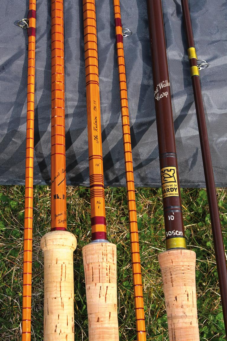 Voici trois cannes de ma collection personnelle. A gauche une authentique Richard Walker MK IV produite par l’atelier B James & Son en 1958. Cette canne a peu ou pas pêché et est dans un état proche du neuf ! Au milieu un véritable objet d’art : une « The Redmire MK IV » réalisée au tout début des années 90 par le grand maître Anthony Croft, l’un des tout meilleurs monteurs de cannes en bambou refendu (c’est du très haut de gamme !). Croft a réalisé une toute petite série de ces cannes pour rendre hommage à Richard Walker qui avait quitté ce monde cinq ans plus tôt. Seules les quatre premières cannes furent numérotées, et j’ai l’énorme chance de posséder le numéro 1 ! Elle était toute neuve quand je l’ai reçu, elle n’avait encore jamais pêché, mais depuis je l’ai essayé (en faisant très attention) et j’ai pris quelques jolies carpes avec. À droite une Hardy Richard Walker Carp de 1969 en fibre de verre respectant les caractéristiques d’une MK IV en bambou refendu originale (même longueur/action/puissance). C’est une très belle canne pour la pêche légère au flotteur…