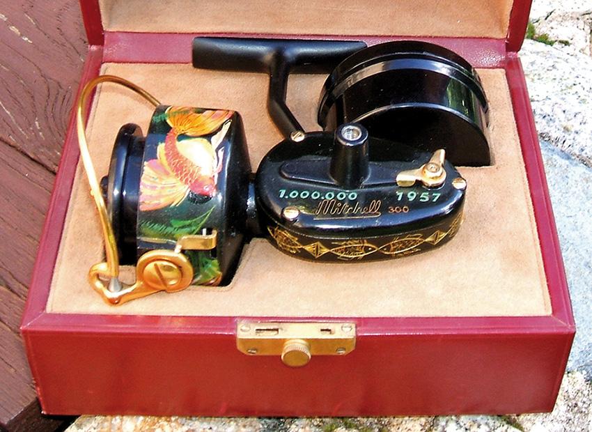 Certains modèles n’ont été fabriqués qu’en tout petit nombre, d’autres sont uniques, comme les moulinets ci-dessus, un modèle surfcasting à bobine « wedding cake » et un autre pour fêter les 1 million de moulinets vendus en 1957 et dont la décoration magnifique a été réalisée par un artiste. Bien évidemment leur valeur pour un collectionneur est inestimable car ce sont de véritables pièces de musée !