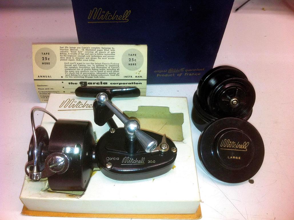 En parlant de collectionneurs de Mitchell, sachez qu’ils sont les plus nombreux aux Etats Unis, suivis par les Hollandais, les Belges, les Anglais et, bien sûr, les Français. Mais on trouve des collectionneurs dans le monde entier, même en Russie, en Afrique du Sud, en Chine et au Japon ! Il faut dire que le nombre d’anciens moulinets Mitchell en très bon état encore en circulation aujourd’hui est considérable, donc se constituer une collection n’est pas encore trop difficile. On en trouve énormément sur Internet (Ebay) et le plus souvent ils partent à des prix très raisonnables. Comptez quelques dizaines d’euros pour un modèle courant du Mitchell 300 d’occasion en bon état, et entre 100 et 150 euros pour le même en état neuf, dans sa boîte d’origine et avec tous ses papiers – appelé « New Old Stock » dans l’univers des collectionneurs (pièces neuves issues d’anciens stocks non écoulés sur le marché), ou « NIB » ce qui veut dire « New In Box » (neuf dans sa boîte d’origine). On trouve régulièrement de très jolis moulinets d’occasion sur les brocantes et marchés aux puces, et bien souvent à de tout petits prix ! Et à chaque fois qu’on trouve un Mitchell 300 ou l’un de ses dérivés il est possible de retracer très facilement l’année à laquelle il a été produit, car chaque exemplaire porte un numéro de série unique.
